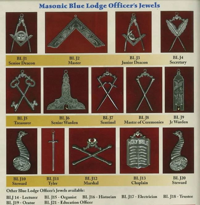 BL Officer’s Jewel Set set includes BL J1 Senior Deacon, BL J2 Master, BL J3 Junior Deacon, BL J4 Secretary, BL J5 Treasurer, BL J6 Senior Warden, BL J7 Sentinel, BL J8 Master of Ceremonies, BL J9 Jr Warden, BL J10 Steward, BL J11 Tyler, BL J12 Marshal, BL J13 Chaplain and BL J20 Steward. (see individual pictures of the officer’s jewels)