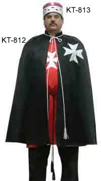 KT 812 Order of Malta black satin mantle lined with white satin. Complete with regulation Maltese cross trim. Adjustable cap can be ordered with this mantle. Shown with KT 813 cap made of red satin with imitation ermine band.
