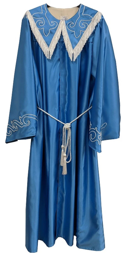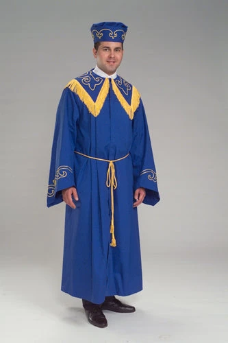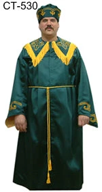 CT 530 One piece robe with embroidered designs on full sleeves and large collar. Fringe on collar. Comes with headdress or headdress sold separately as item # CT-531. Made in Polyester Satin or Poplin. Costumes are normally tailored in size 50. (Larger sizes available on request.)